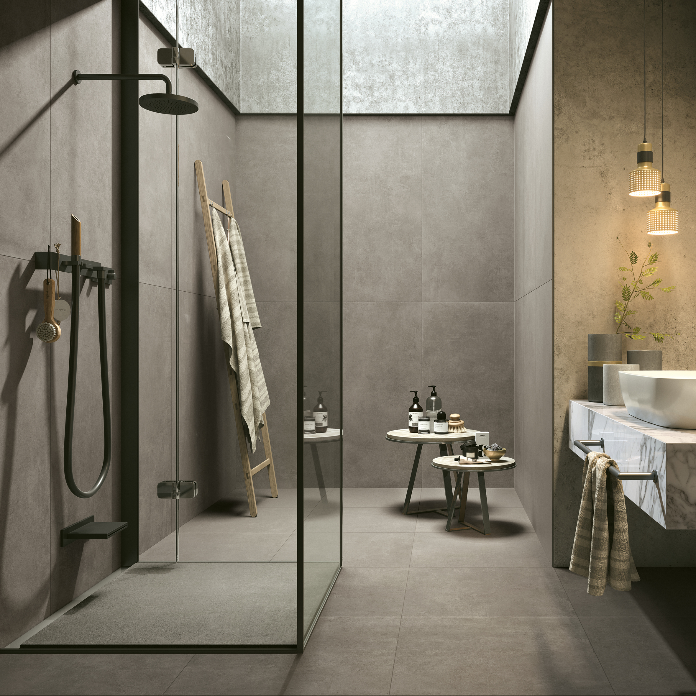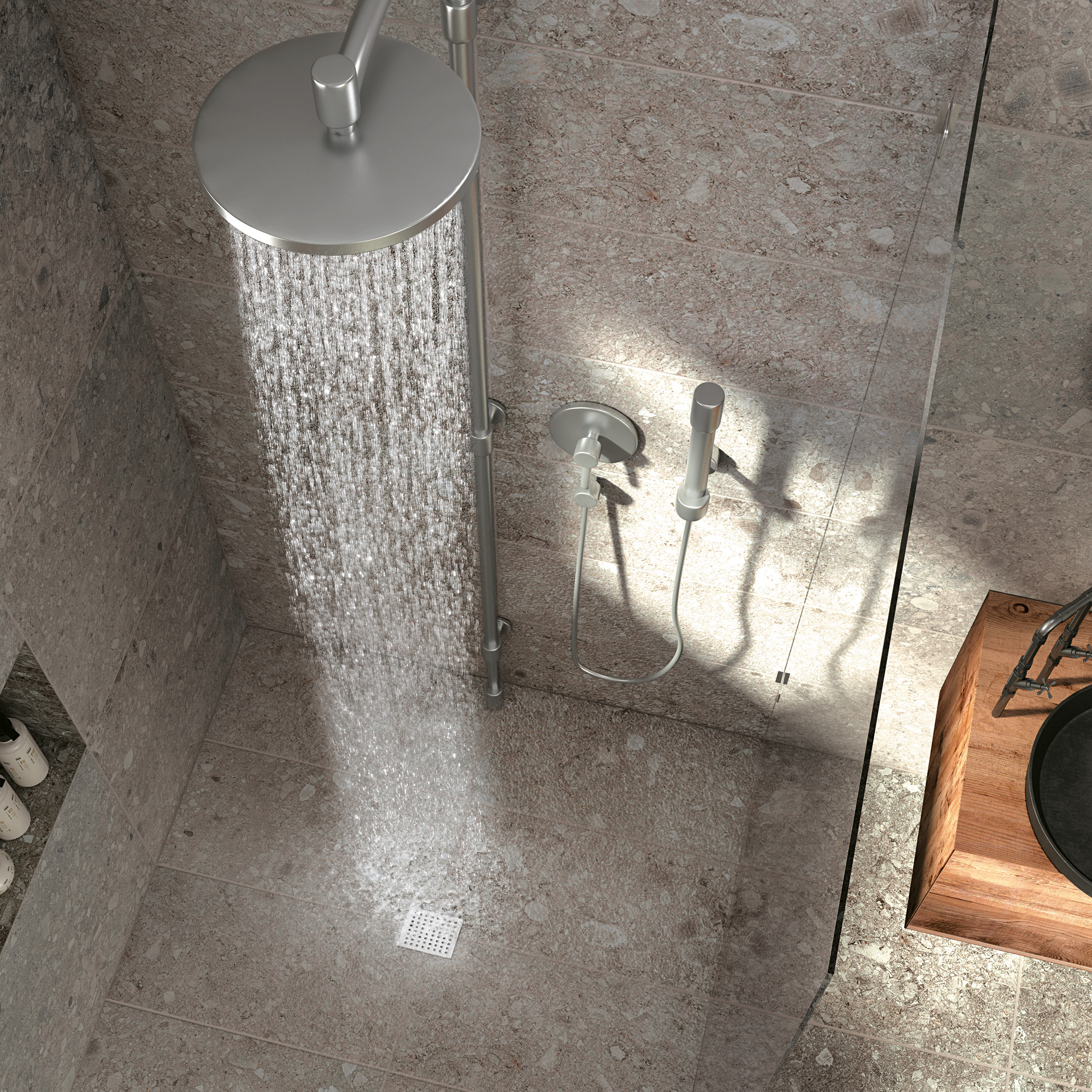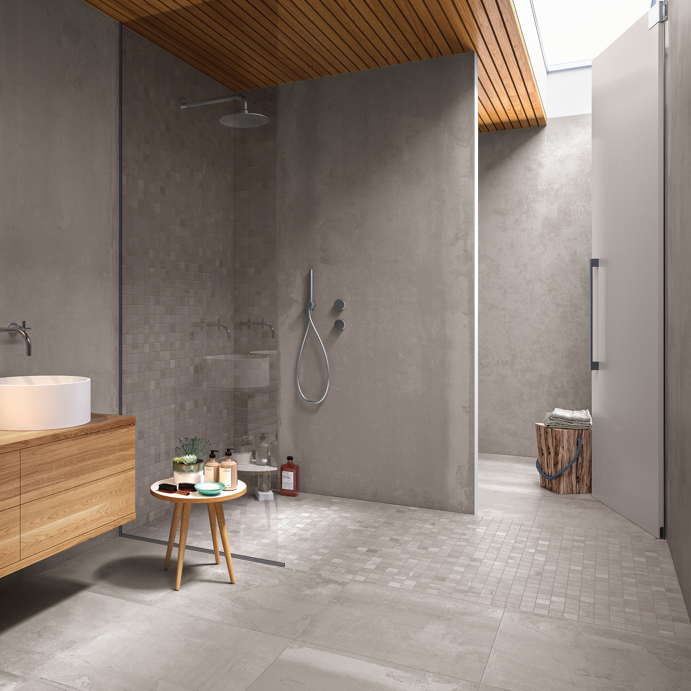 Suihkualue on rajattu mosaiikilla, ja saman sarjan suurlaatoilla seinistä on saatu lähes saumattomat. Lattia- ja seinälaatat: LPC Revolution