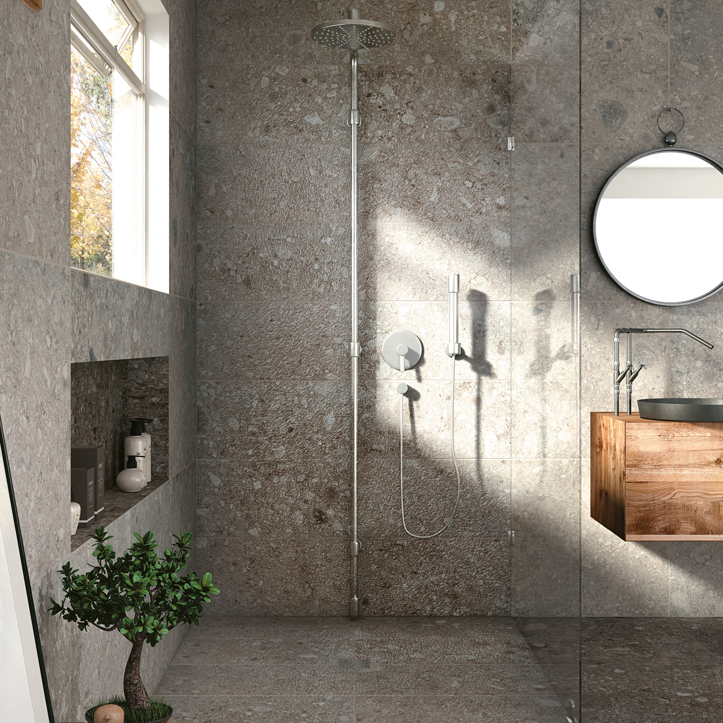 Suuri sadesuihku tuo kylpyhuoneeseen hotellimaista tunnelmaa. Kivi- ja puukuosiset pinnat viimeistelevät luonnollisen ilmeen. Lattia- ja seinälaatat: LPC Nordik