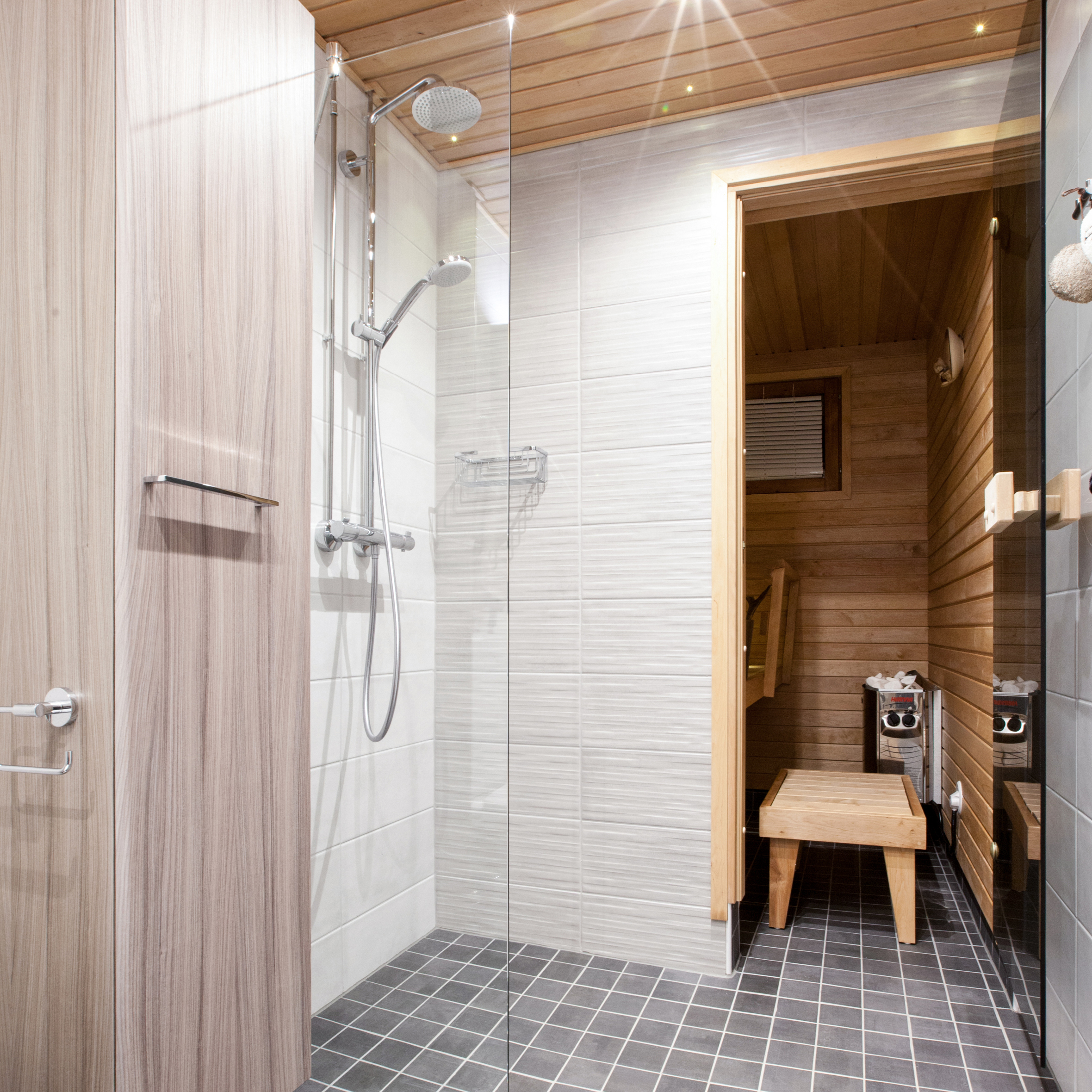 Struktuuripintainen laatta elävöittää mukavasti koko kylpyhuoneen.