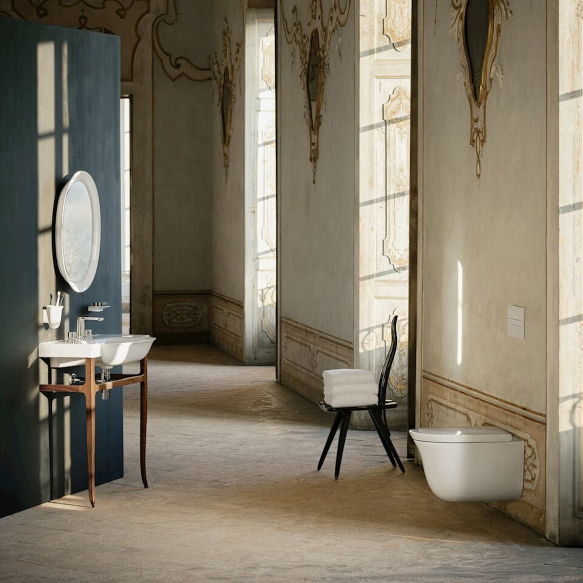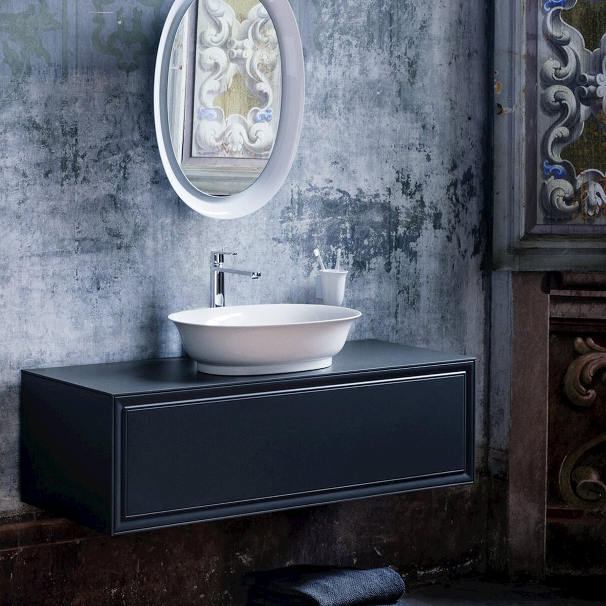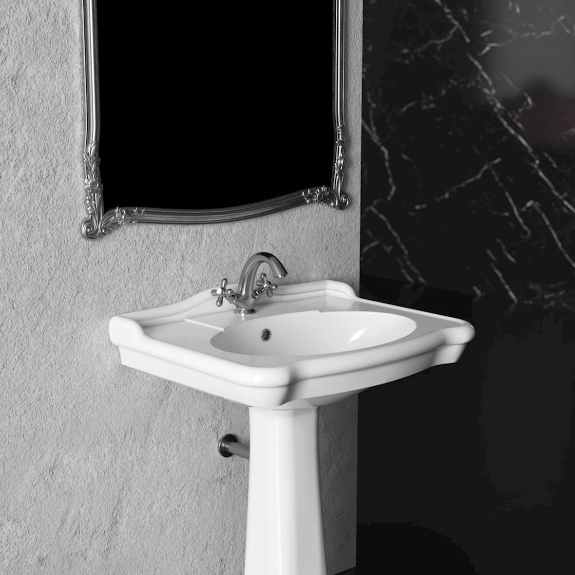 Koristeellisilla kylpyhuonekalusteilla saadaan romanttista tunnelmaa moderniimpaankin kylpyhuoneeseen. Pesuallas: Alice Ceramica BOHEME