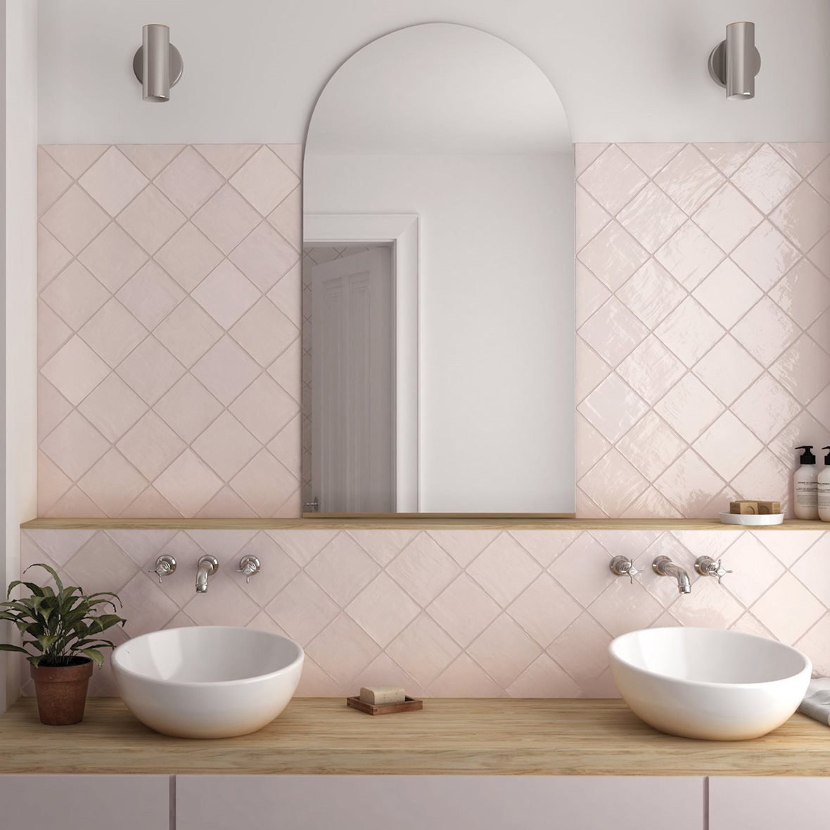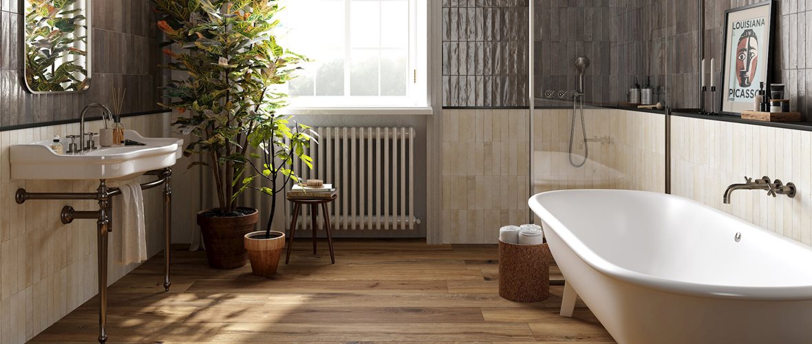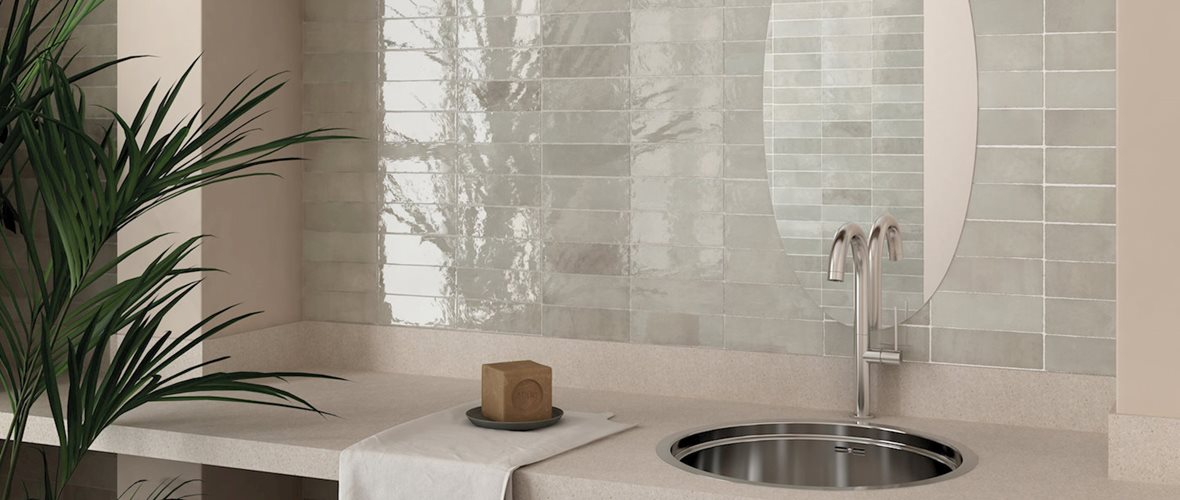 Herkkä ja naisellinen koristeraita herättää kylpyhuoneen eloon. Seinälaatat: LPC Romance