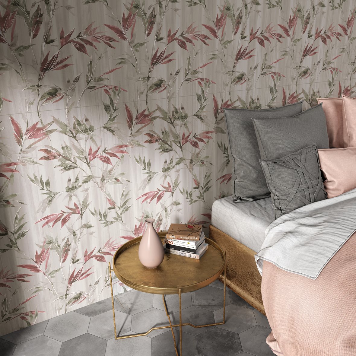 Kukkakuviot ovat herkkä valinta. Seinälaatat: LPC ShoWall.