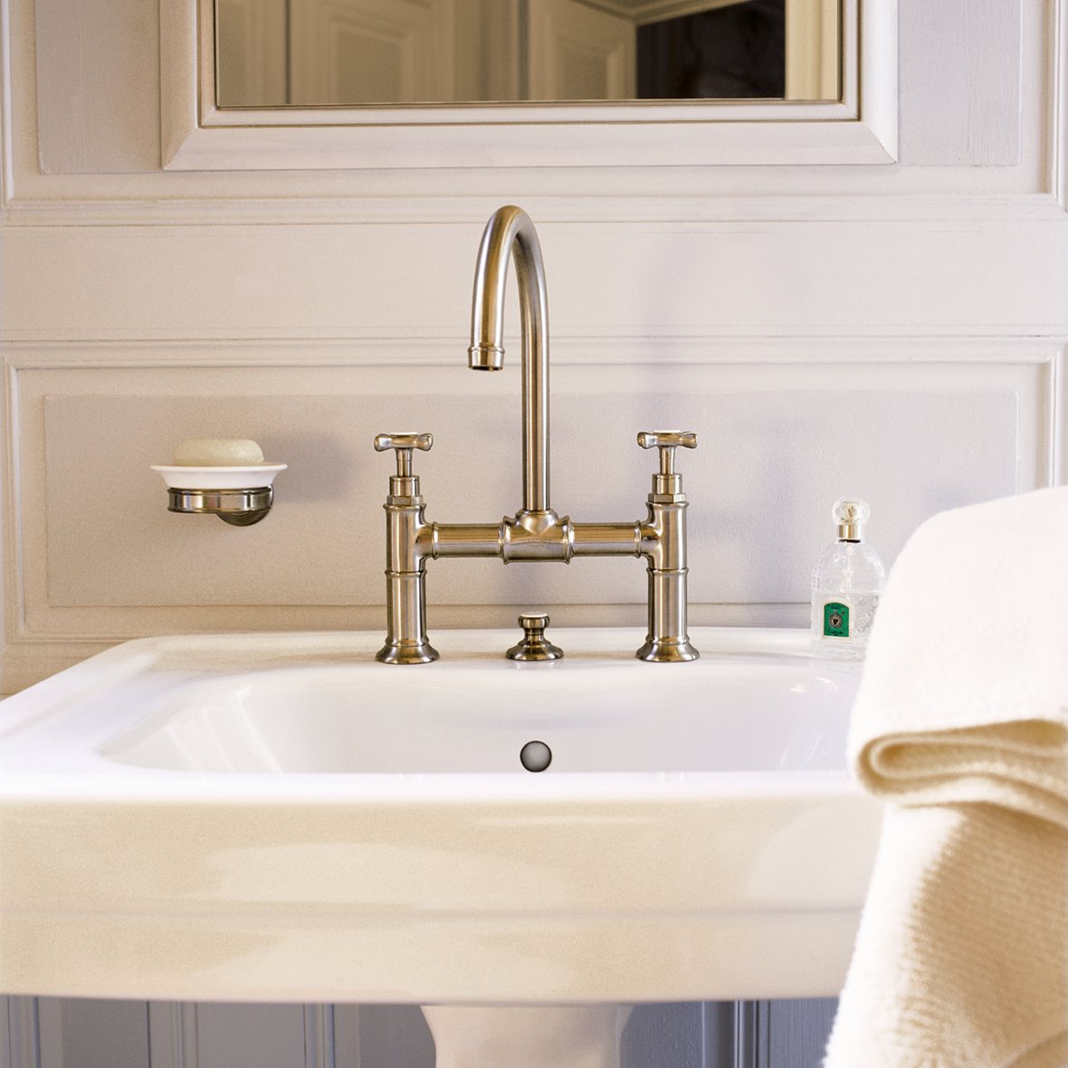 Kaksiotehana ja jalallinen allas tuovat kylpyhuoneeseen menneen ajan tunnelmaa. Hana: Axor Montreux