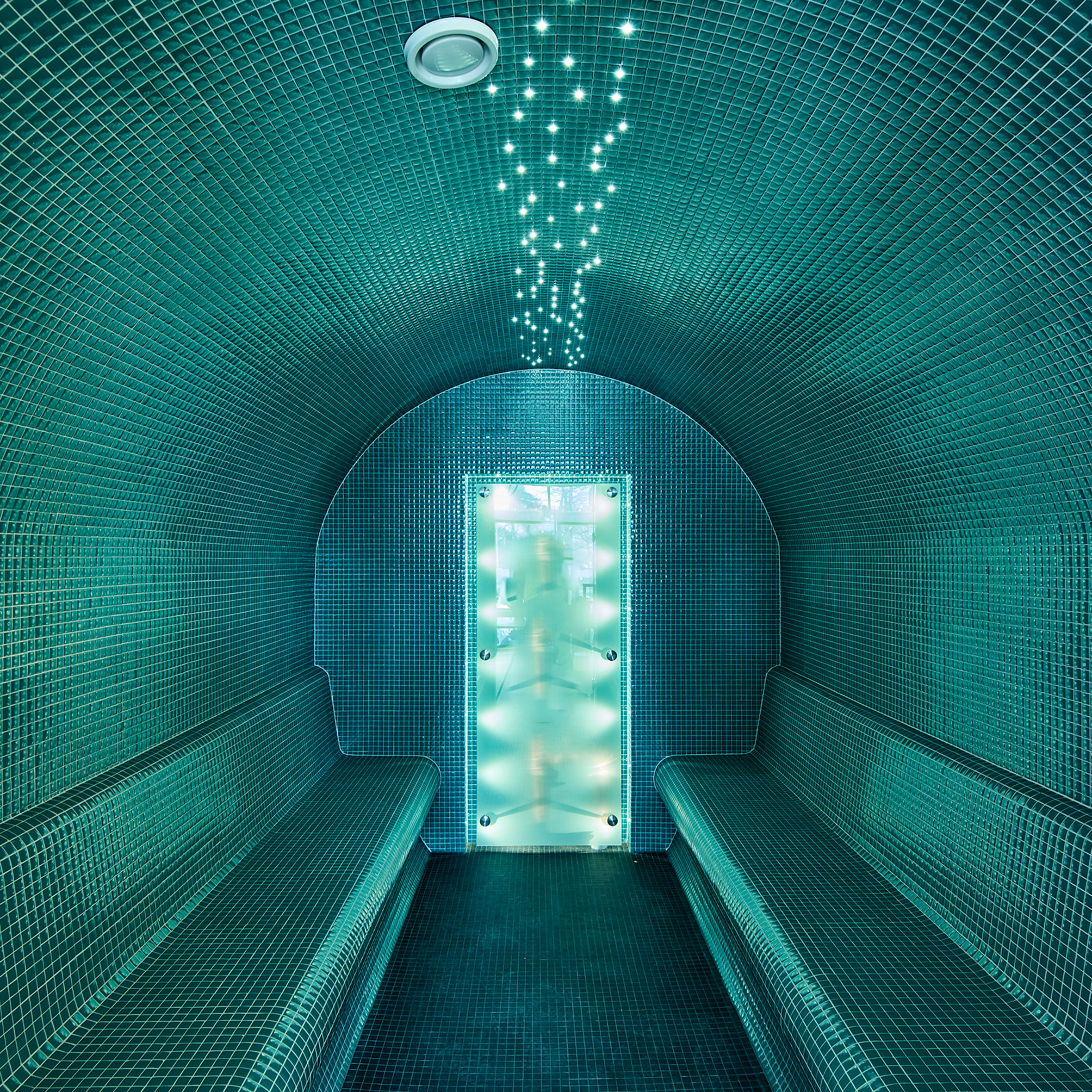 Höyrysauna johdattelee kävijänsä etelä-eurooppalaiseen kylpylätunnelmaan turkoosivärisellä mosaiikillaan, jolla koko pyöreänmuotoinen sauna on laatoitettu.