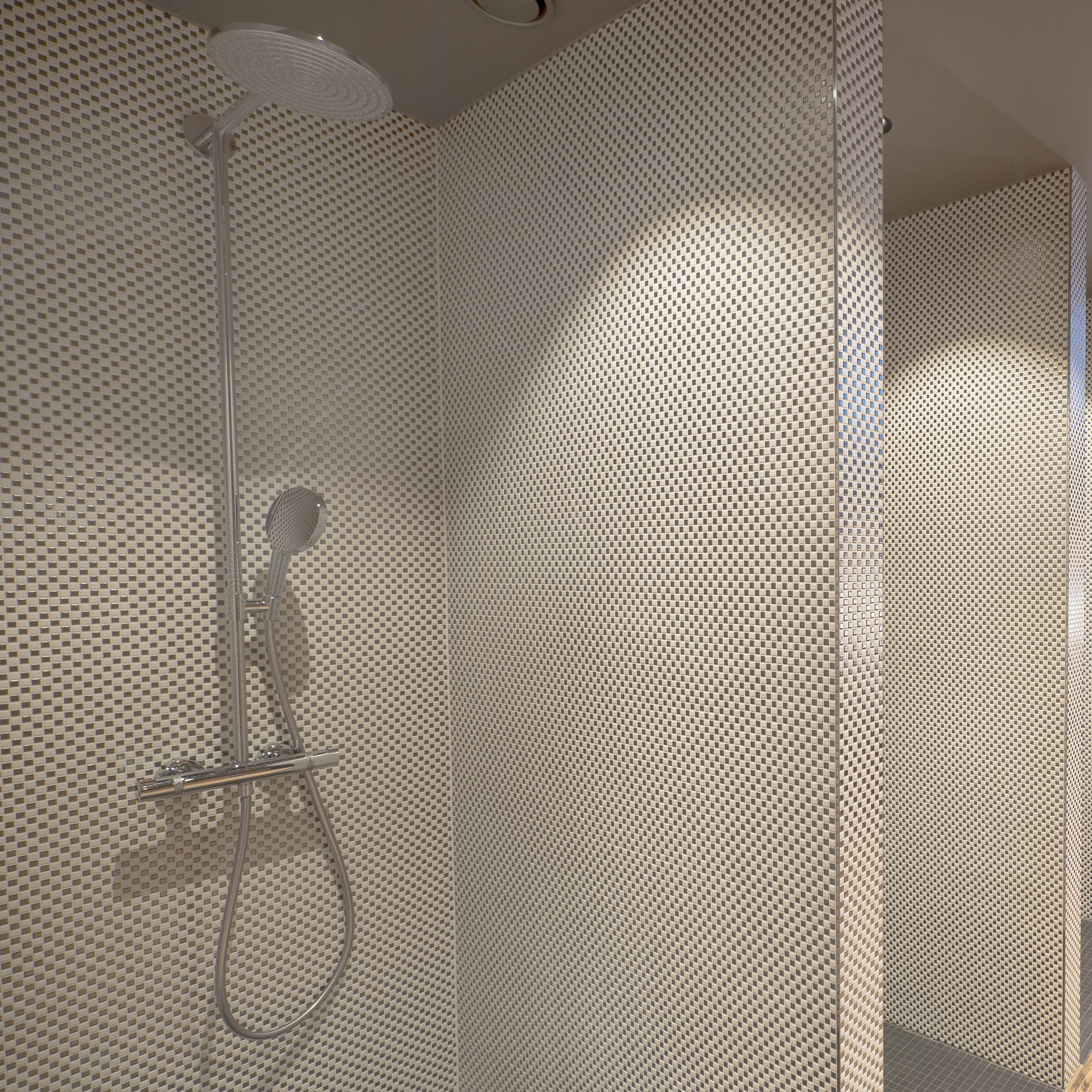 Suihkutilaan haluttiin panostaa näyttävyyden kannalta, joten suihkusyvennyksien laatoitukseen valittiin upea LPC Geometrie-mosaiikki.