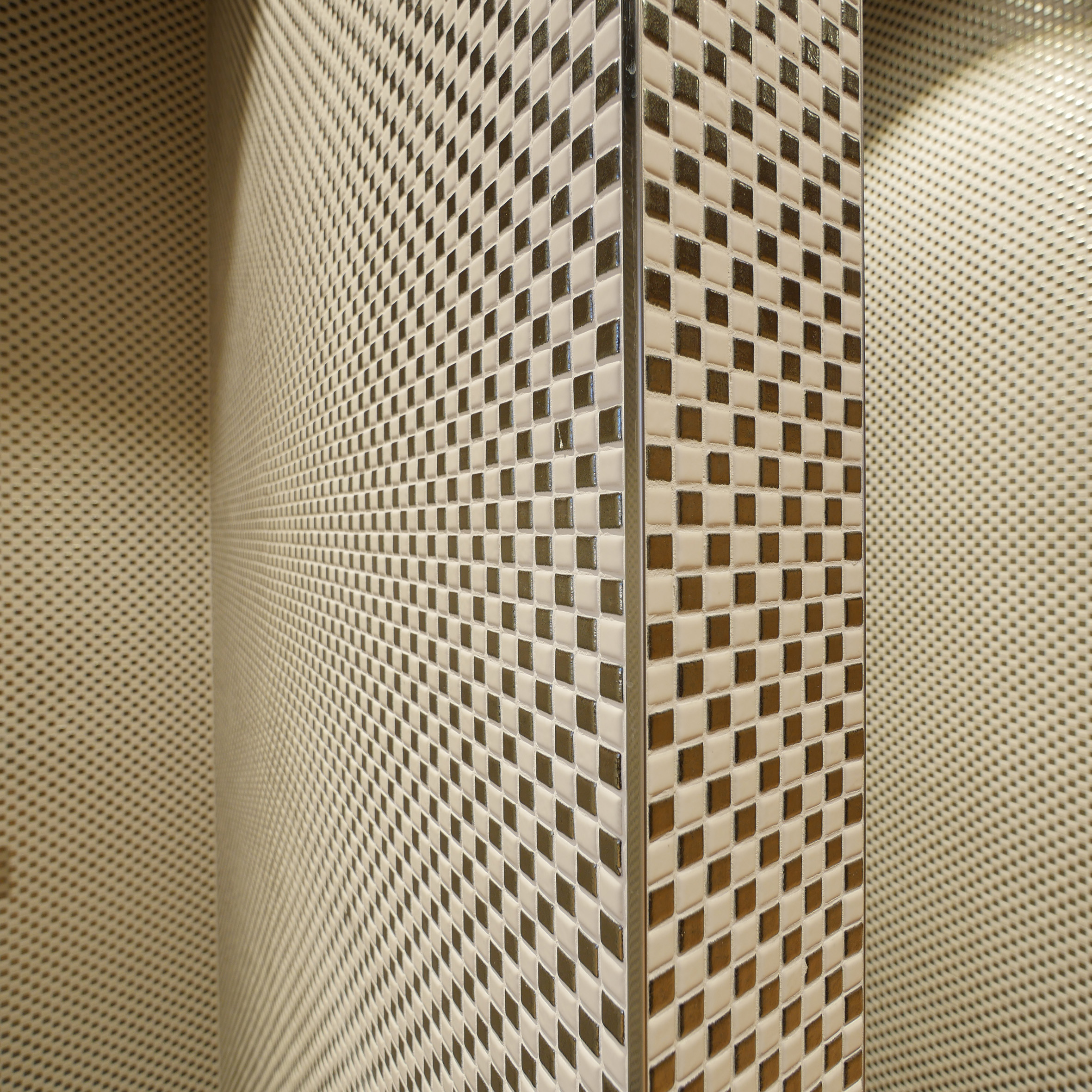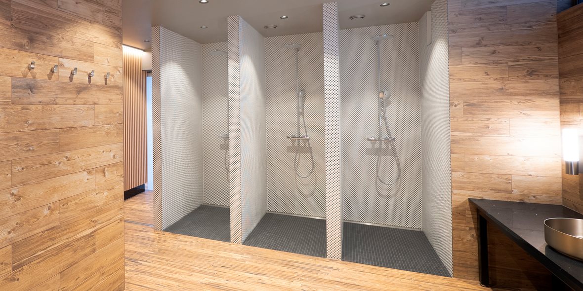 Projektissa valikoitiin huolellisesti, mihin asioihin haluttiin todella panostaa. Höyrysaunan lisäksi näyttävyyttä haluttiin luoda suihkutilassa. Tilaan rakennettiin Wedin avulla suihkusyvennykset, joiden päällysteeksi valittiin hulppea LPC Geometrie -mosaiikkilaatta tehosteeksi. Kullanhohtoinen mosaiikki tuo koko tilaan arvokkaan ja loisteliaan tunnelman.