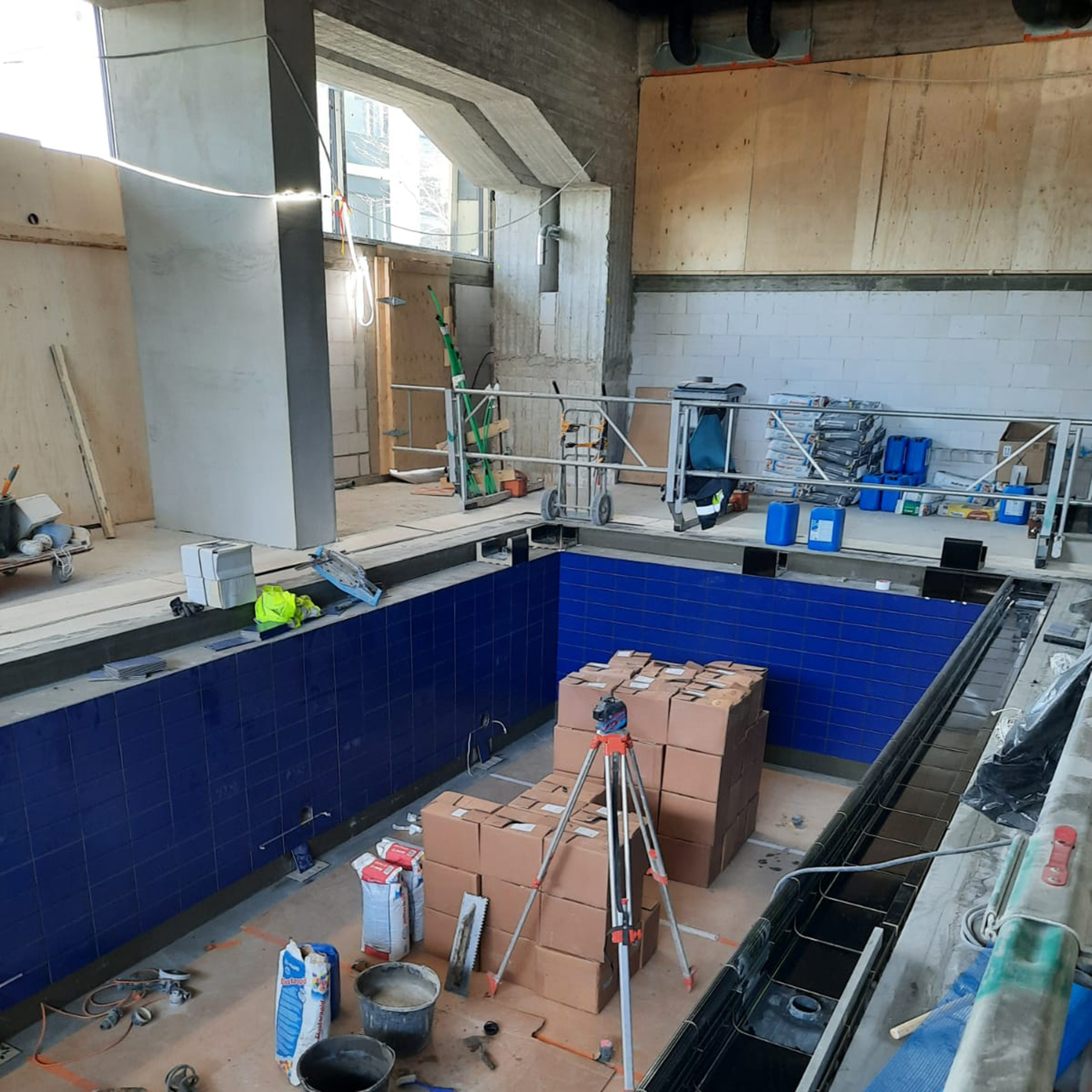 Uima-allastila ja sen ympäristö rakennettiin vanhan toimiston tilalle täysin tyhjästä, joten projektiin tarvittiin avuksi sekä lujaa ammattitaitoa että kokemusta.