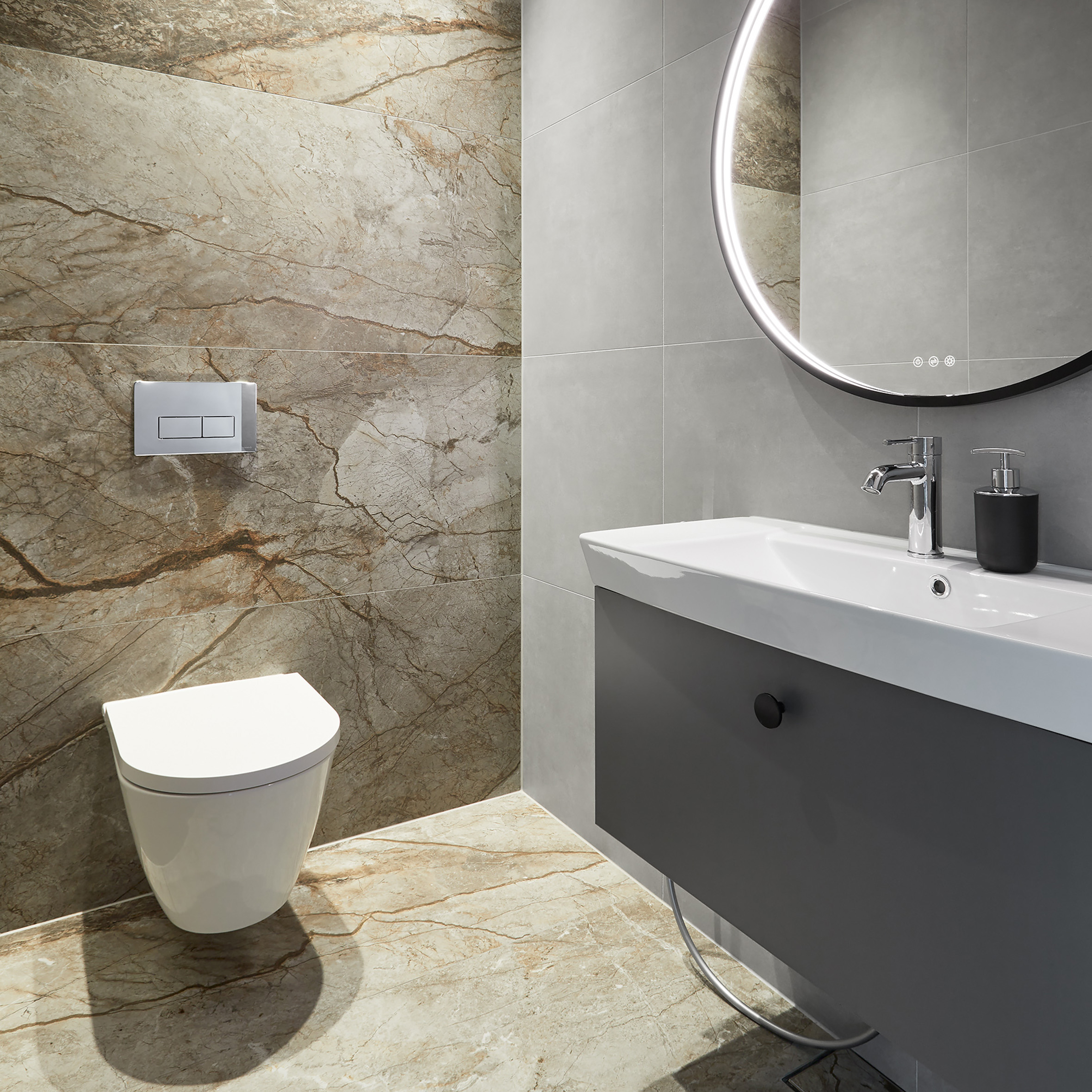 Kalusteet wc-tilassa pidettiin minimalistisina, jotta upea LPC Aventura Silver Roots -laatta pääsee oikeuksiinsa. Wc: Laufen Kartell, Allaskaluste: Dansani Mido+, Peili: Dansani YOU Moon