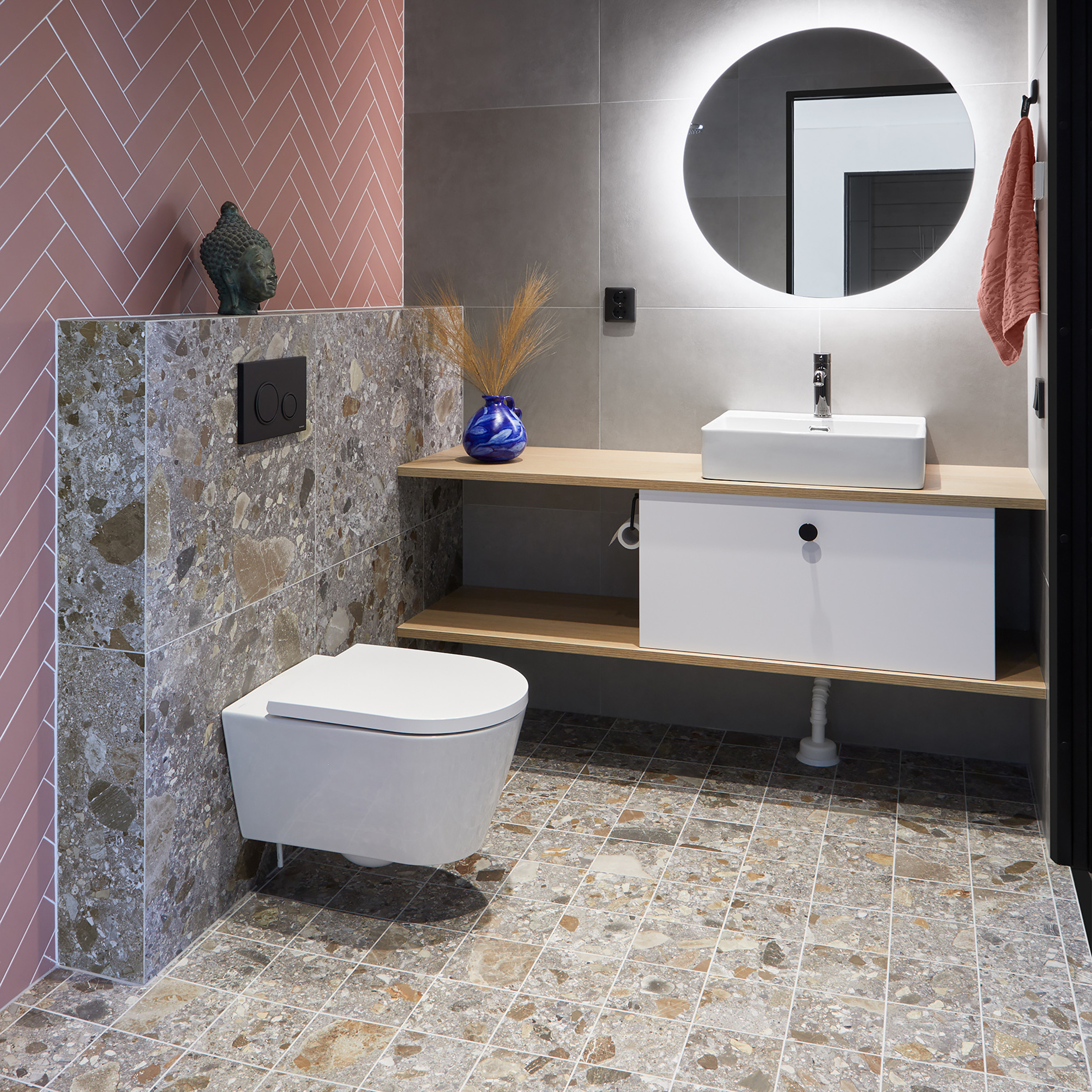 Värikkään tehosteseinän ja kirjavan terrazzo-laatan pariksi muut elementit wc-tilassa pidettiin rauhallisina.