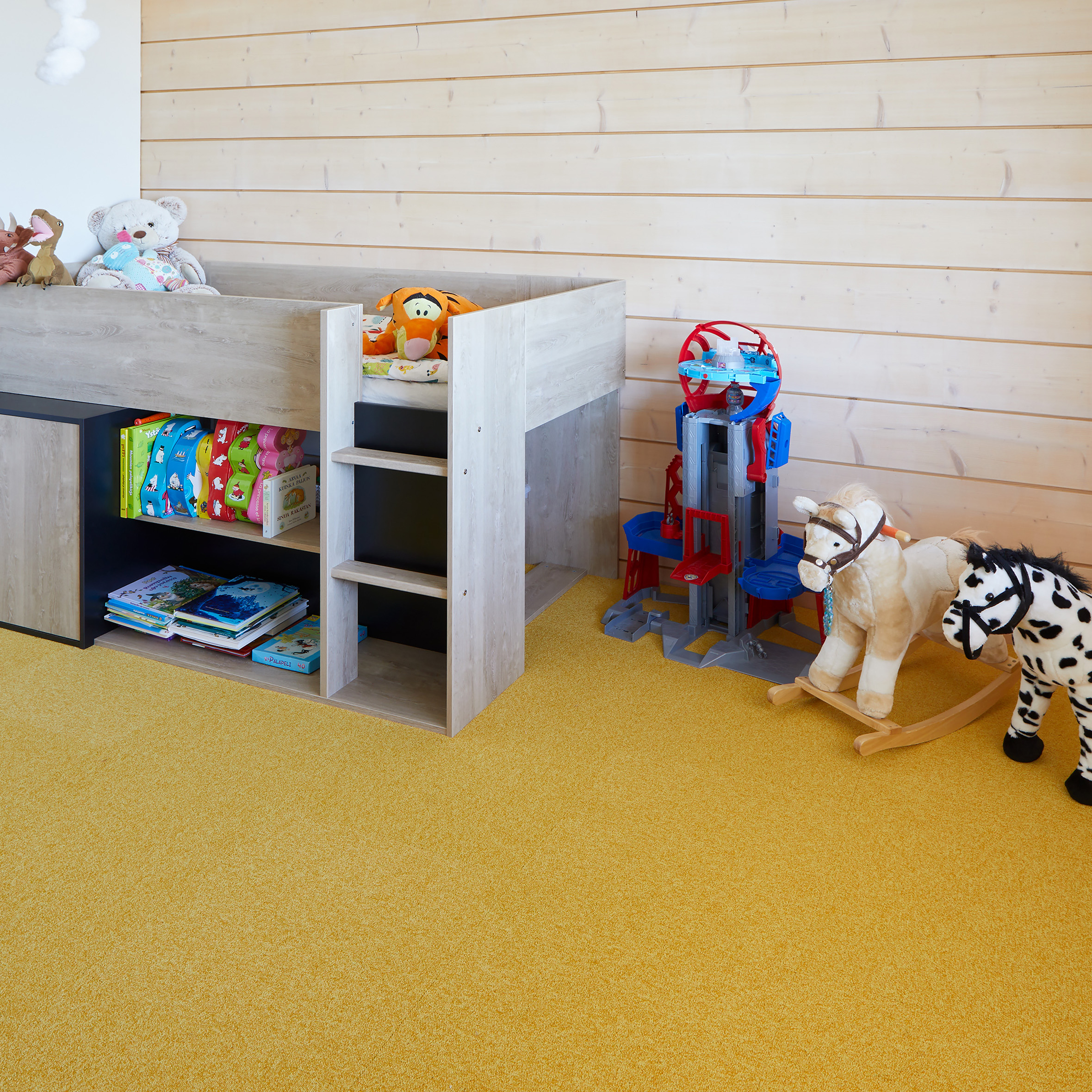 Tekstiililaatta sopii ominaisuuksiltaan erinomaisesti lastenhuoneisiin. Lattiassa Interface Heuga 727 Sunflower