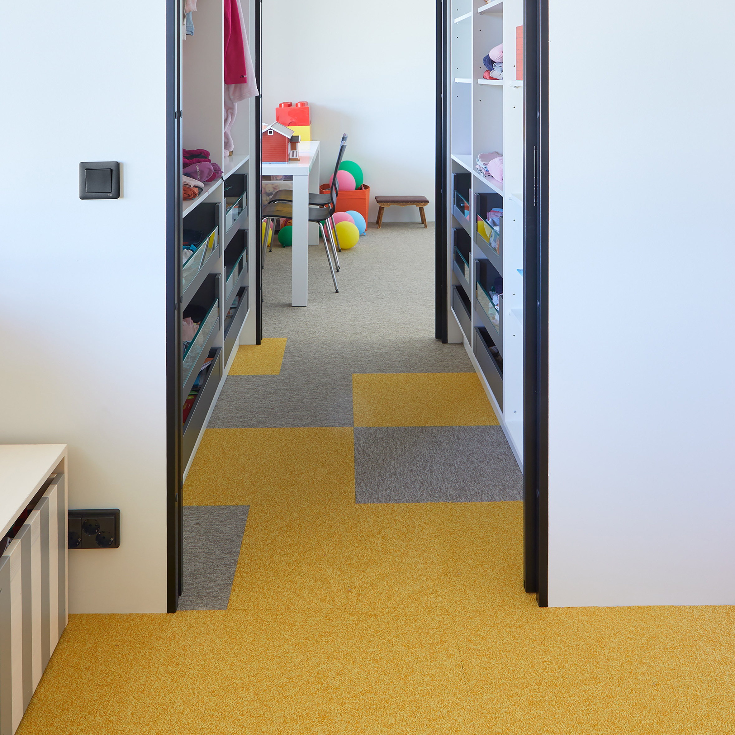 Lastenhuoneiden lattiat päällystettiin Interacen tekstiililaatoilla, toinen huoneista pirteän keltaisella Heuga 727:lla ja toinen neutraalin harmaalla Output Loopilla. Koska tekstiililaatta on liimattoman TacTiles-tarrakiinnityksensä vuoksi helppo muokata, sopii se lattiamateriaalina erinomaisesti kasvavien lasten huoneisiin. Jos mieli muuttuu vanhetessa, on lattia suhteellisen vaivatonta vaihtaa ja päivittää uuteen. Interfacen tekstiililaattavalikoimasta löytyy suuri kirjo erilaisia värejä ja kuoseja, joista valita mieleisensä. Lisäksi laatat on suunniteltu siten, että niitä pystyy yhdistellä keskenään ilman listoja rajattomasti. Lastenhuoneiden välillä siirtymä laatojen välillä toteutettiin pikselimäisesti vaatehuoneen kautta.