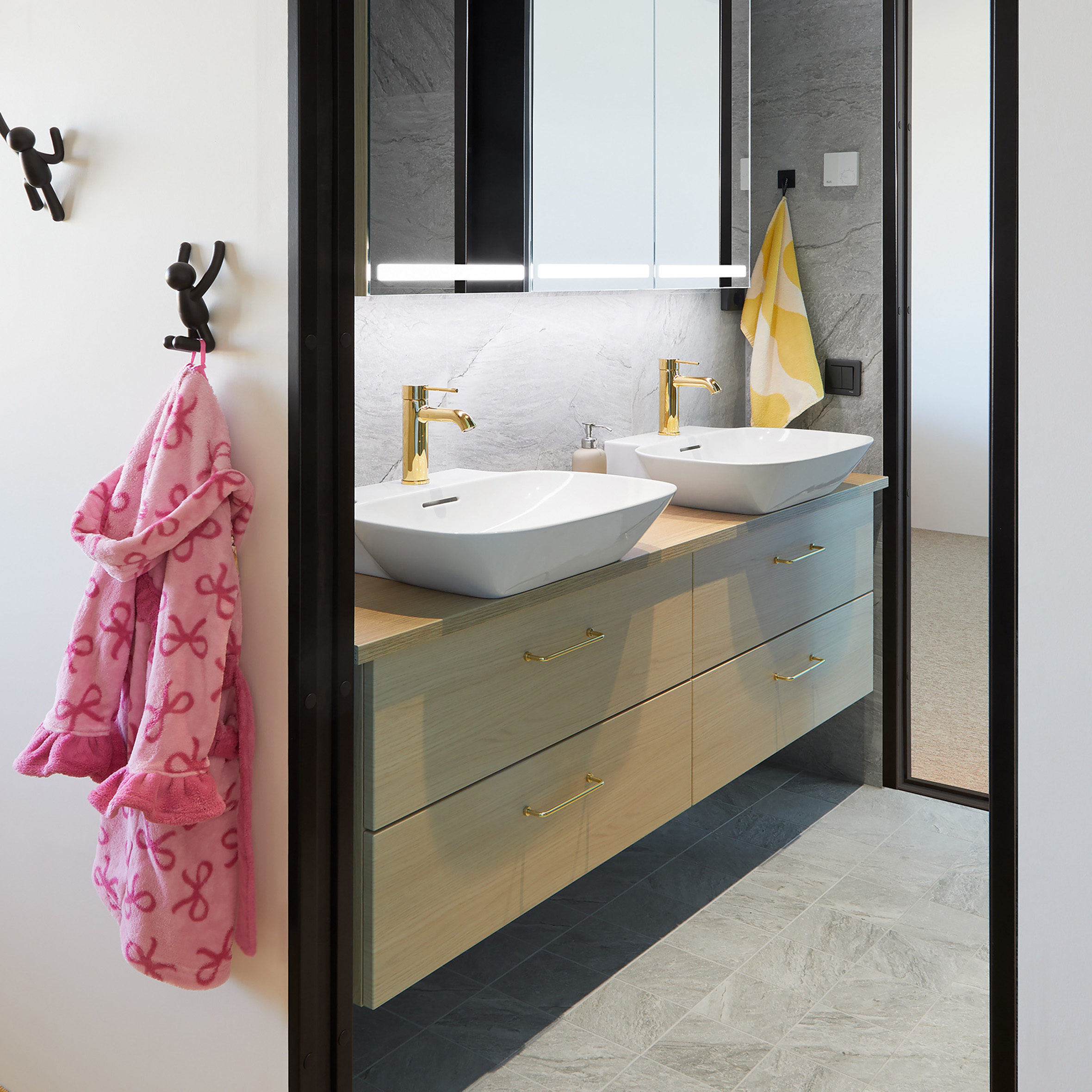 Lastenhuoneiden välille rakennettiin jaettu kylpyhuone. Tulevaisuutta ajatellen järkevintä oli valita allaskalusteeksi kahdella pesualtaalla varusteltu allaskaappi, jotta molemmat saavat oman tilansa. Kahdella Dansanin Luna-allaskaapilla saatiin luotua koko seinämän levydelle allaskaluste, joka täydennettiin Laufenin INO-pesualtailla. Kaappien Grace-vetimet valittiin sointumaan kauniisti yhteen messinkisten Grohen Essence S pesuallashanojen kanssa.