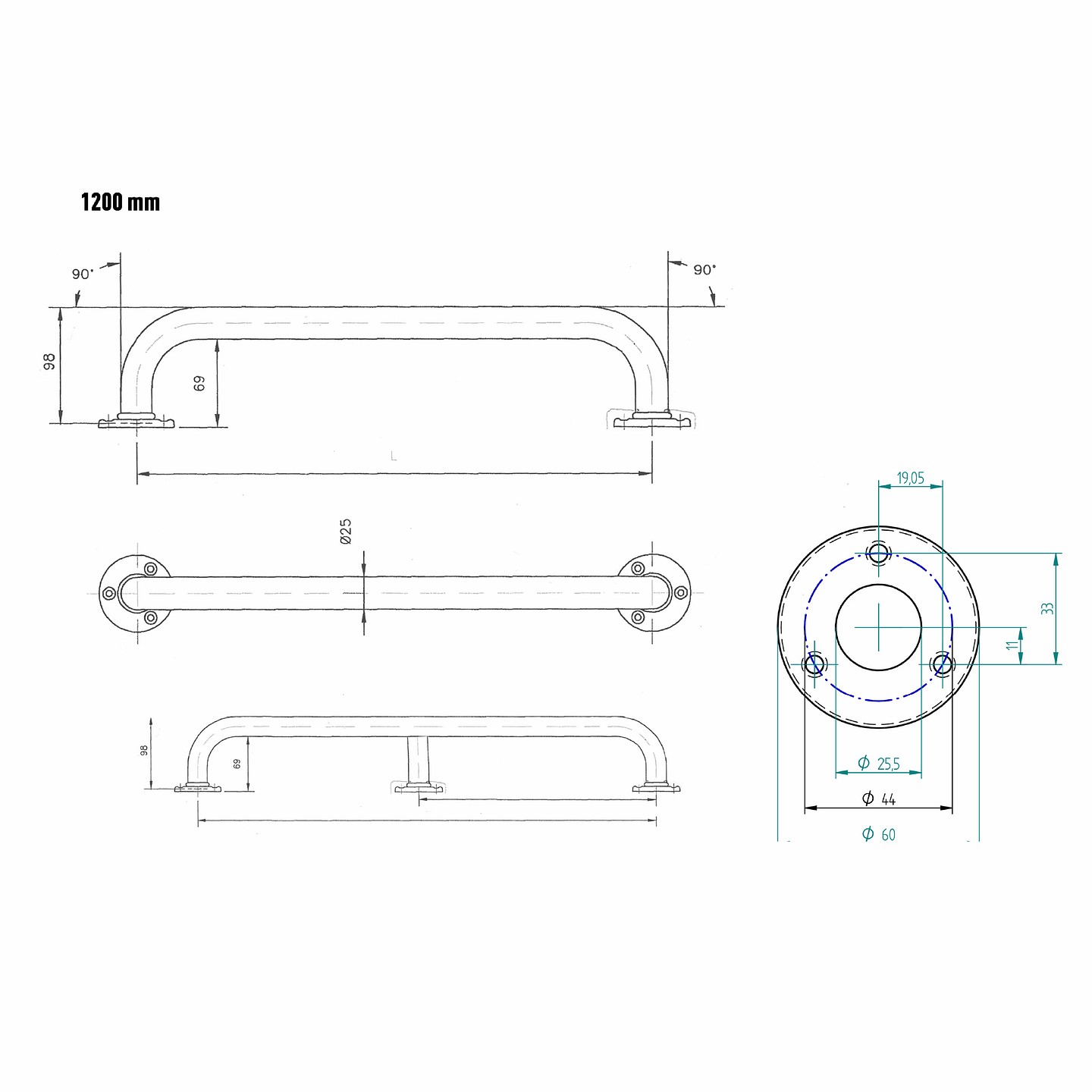 Liikkuva+ Prime suora tukikahva 120x6x9 cm valkoinen sileä 25 mm