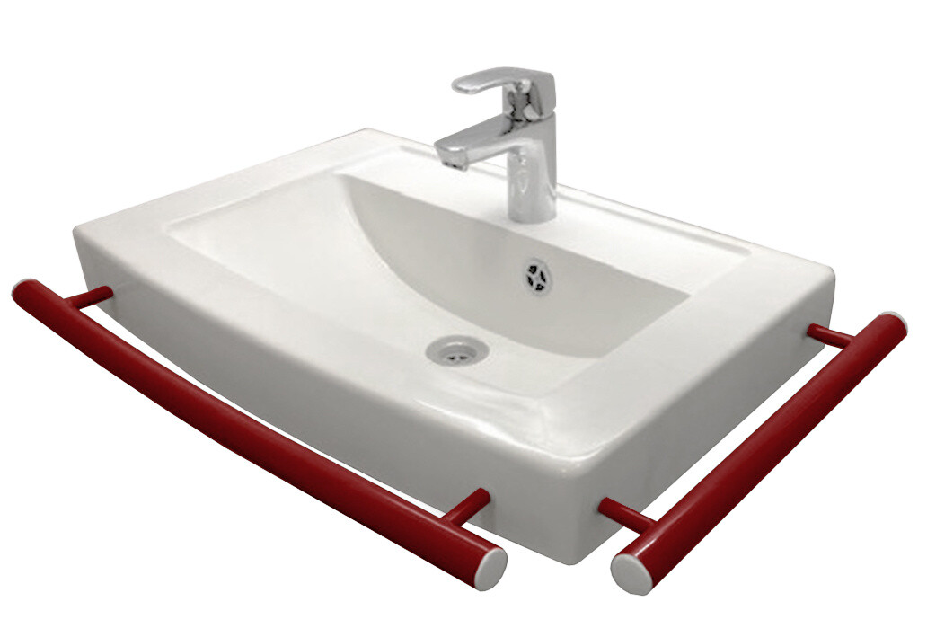 Liikkuva+ seinään asennettava pesuallas tukikaiteella 69,3X47,3X14 cm punainen/valkoinen valumarmori hanareikä erillinen ylivuoto antibakteerinen kätisyys oikea