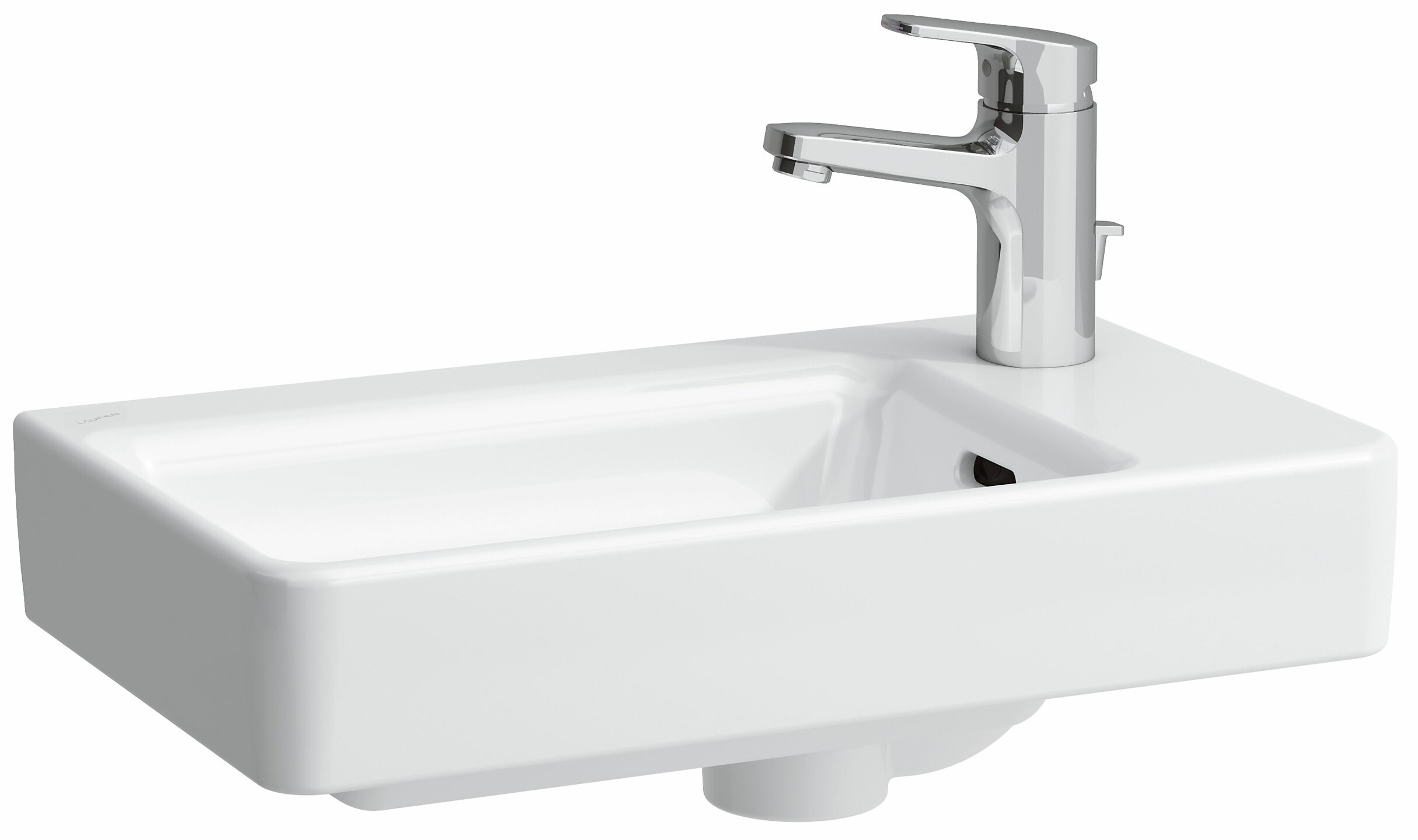 Laufen Pro S seinään asennettava pesuallas 48X28X15 cm kiiltävä valkoinen posliini hanareikä oikealla ylivuotoaukko kulho vasemmalla