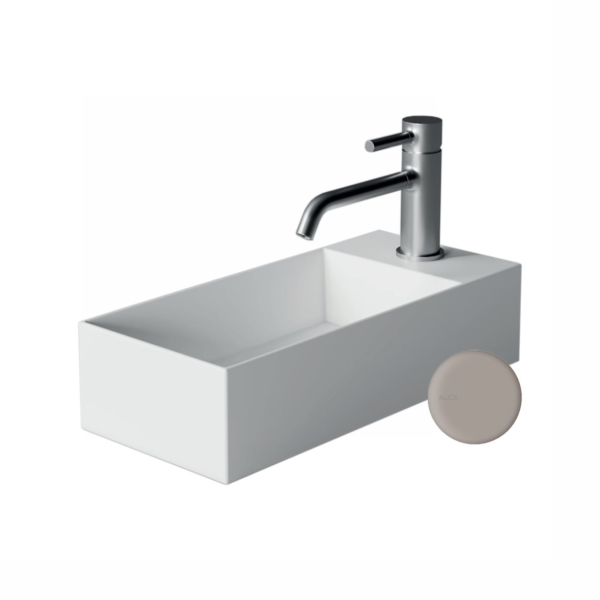 Alice Ceramica SPY seinään tai tason päälle asennettava pesuallas 45X20X11 cm harmaa posliini hanareikä oikealla ilman ylivuotoaukkoa kulho vasemmalla