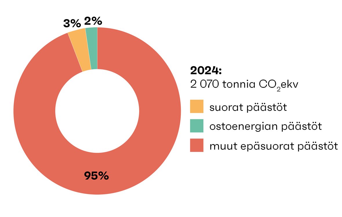 Olemme sitoutuneet Suomen kansallisen tavoitteen mukaisesti nettonollapäästöihin vuoteen 2035 mennessä. Seuraamme tarkasti oman toimintamme hiilijalanjälkeä, joka lasketaan yhteistyössä Pääkaupunkiseudun Kierrätyskeskus Oy:n kanssa GHG Protocol -standardin mukaisesti. Vuonna 2024 kokonaishiilijalanjälki oli 2 070 tCO₂e – suurimmat päästölähteet liittyivät logistiikkaan, ostopalveluihin ja käyttöomaisuuteen.